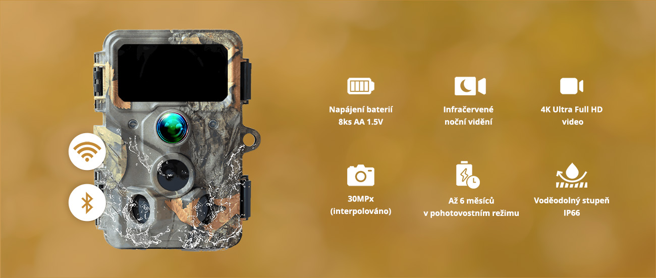 WIFI fotopast Wachman Aldo zachycuje 4K nativní video a 30 megapixelové křišťálově čisté fotky s pěkným záznamem zvuku. Fotopast má vestavěnou funkci WIFI a ovládání přes aplikaci, stáhněte si ji (Hunting Camera 4K) do svého mobilního telefonu a poté se připojte k WIFI. Nastavení můžete upravit tak, abyste si prohlíželi nebo stáhli fotografie a videa přímo do telefonu.