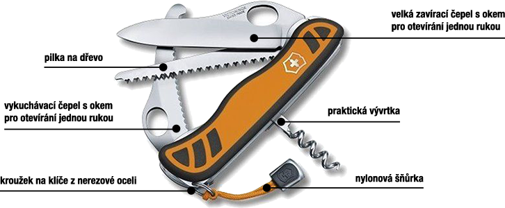 Funkce | Velký zajišťovací nůž, vývrtka, kroužek na klíče z nerezové oceli, vykuchávací nůž, pilka na dřevo, nylonová šňůrka |