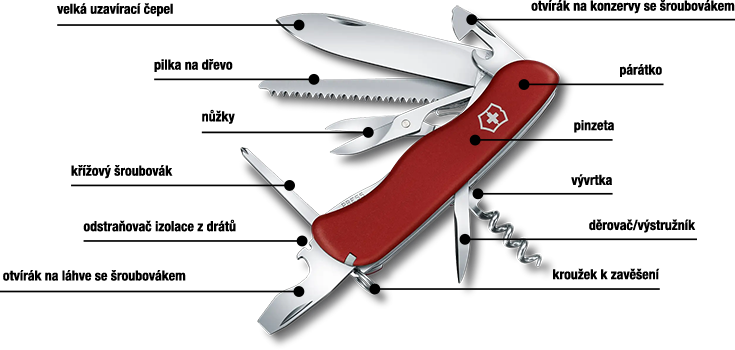 Funkce | Velká uzavírací čepel, vývrtka, otvírák na konzervy s malým šroubovákem (i na křížové šrouby), otvírák na láhve se šroubovákem a odstraňovačem izolace drátů, děrovač/výstružník, nerezový kroužek na klíče, pinzeta, párátko, pilka na dřevo, nůžky, dlouhý křížový šroubovák |